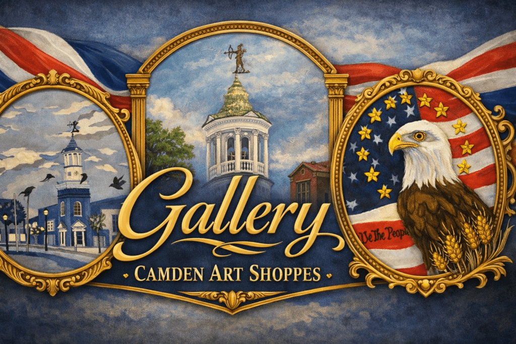 - Online Gallery : Not close enough to visit? Want a beautiful print, coffee mug, pillow (or even a shower curtain!) uniquely designed with a local artist’s expertise? Check Camden Art Shoppes Gallery on Fine Art America. Our selection there is growing every day.