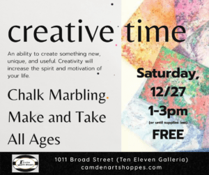 FREE event for all ages Saturday 12/27. Chalk Marbling is a fun way to make small works or a greeting card. All supplies are including. Walk in.