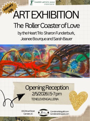 The Heart Trio Sharon Funderburk, Jeanee Bourque and Sarah Bauer are exhibiting the Roller Coaster of Love the month of February 2026 in the Elevator Annex Gallery at Ten Eleven Galleria Tuesday - Saturday 12-6. The exhibit is a free public event safe for families.