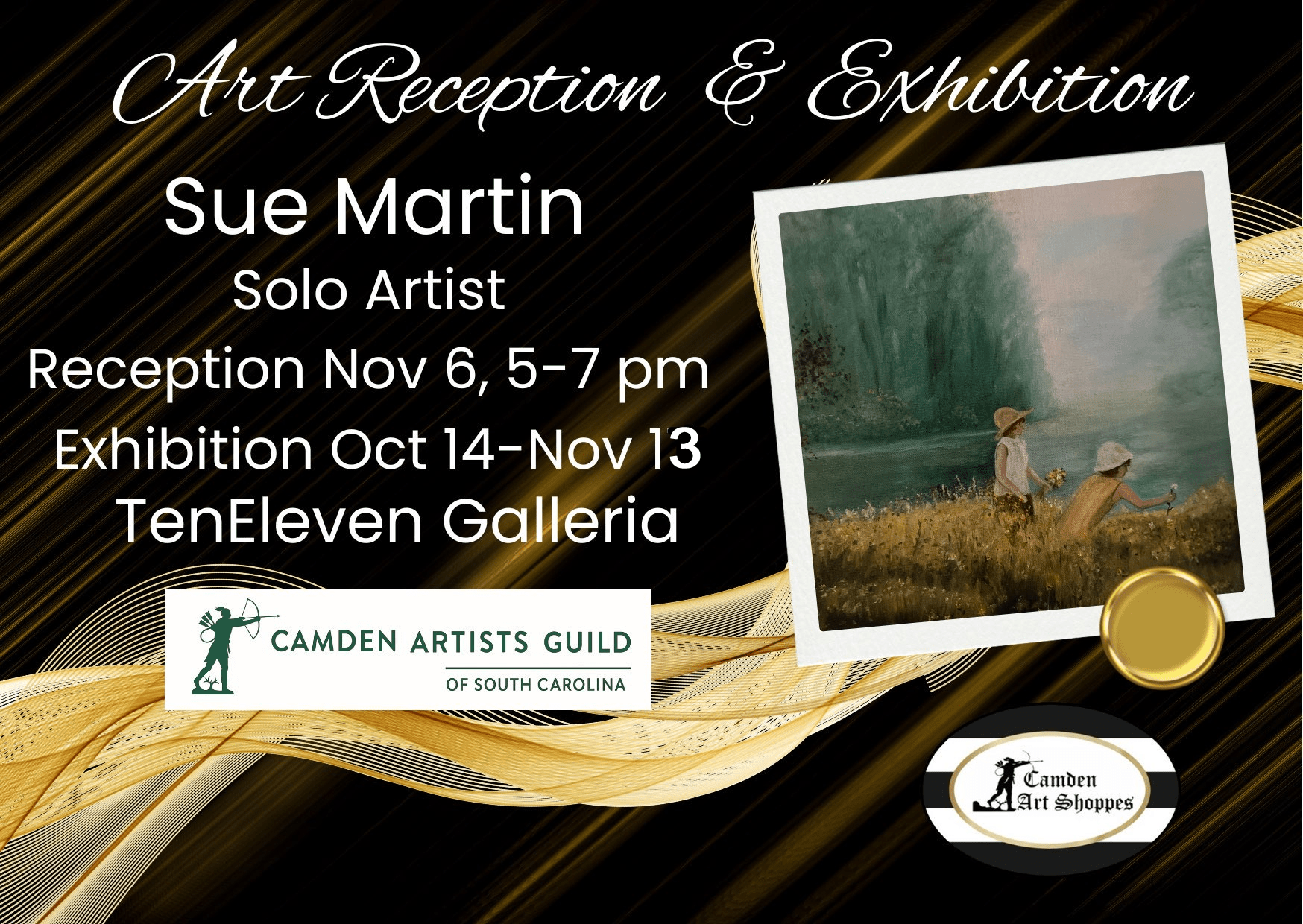 Camden Art Shoppes 1011 Broad Street, Camden, SC, United StatesCome celebrate the life of Sue Martin through her art Exhibit at TenEleven Galleria Oct 14-Nov 17. The art on display is for sale. You can meet Sue’s family at the art reception 11/6 and enjoy conversation, art, wine and hors d'oeuvres. Margaret "Sue" Lilly Martin came to South Carolina in 1972 when her husband,...